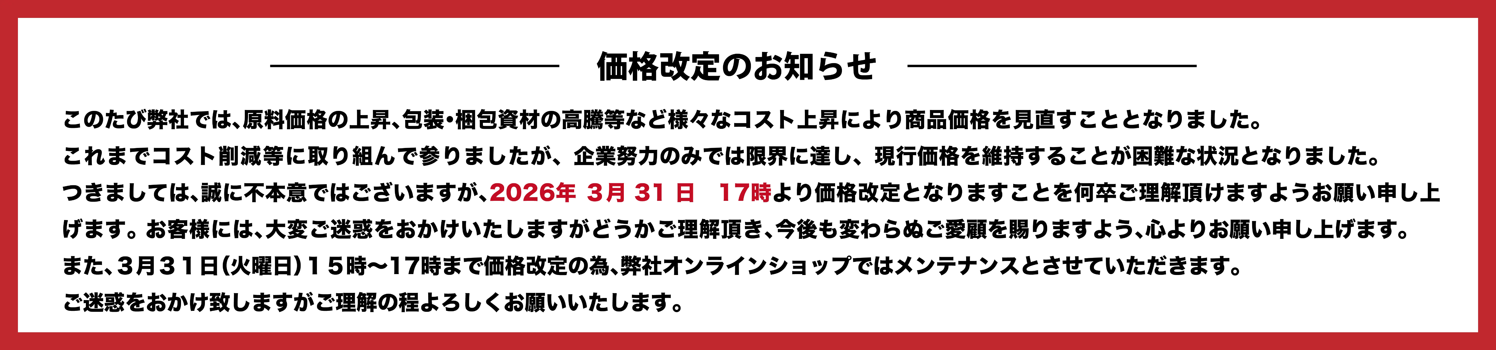 つきましては誠に不本意ながら2026年4月より価格改正の実施をさせて頂きます。お客様には大変お心苦しいお知らせとなりますが何卒諸事情をご賢察くださいますようお願い致します。